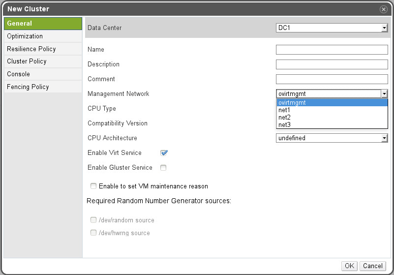 - The new parameter (management network) will be added in “New cluster” screen. The parameter will have the default value of ovirtmgmt if that is present in the DC and the user will be able to choose any other network as the management one.