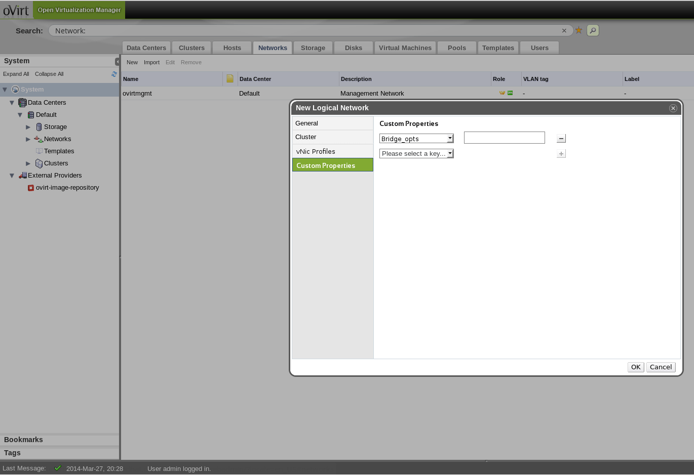 Above you can see that in the networks tab, in the dialog for creating a new logical network, it is possible to define custom network properties, which will include bridge options (for VM networks) by default. These custom properties will be applied upon any assignment of the network to a NIC on a host, unless overridden as described before.