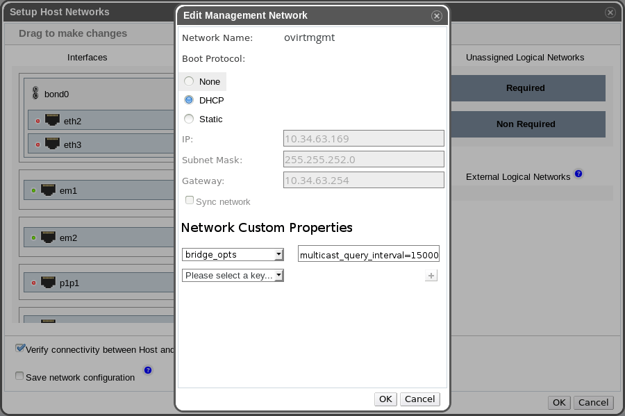 - Either via the webadmin console or via REST (see description how below), as part of a setup networks action, supply a custom property for the network of your choice, whose key is “ethtool_opts” and whose value is the arguments you’d like ethtool to apply.