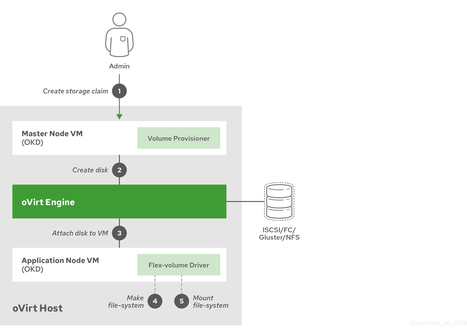 Kubernetes, the cluster manager of openshift, has an api for dynamic storage provision for its running containers. Its purpose is simple, call out some executable out there that will prepare some destination path a node, that can passed in as a mount to a given container. This is called flex volume plugin. As a preparation step, kubernetes will call another plugin that will prepare the disk space. This is called volume-provisioner. Together they enable dynamic provisioning of volumes (container disk space). This project implements the 2 plugin mentioned above, and deploys them on openshift. In high level, the preparation step (volume-provisioner) is creating a disk in oVirt, plain and simple, using the oVirt REST-API The second step, where the flex volume kicks in, is again calling oVirt REST API, to attach a disk into the VM, which is actually an openshift node. That disk is then being mounted and is ready to be mounted into a container. One of the main advantages of such flow is that openshift layer is totally indifferent of the type of storage which oVirt is using, which allows oVirt to use whatever it supports, NFS, Gluster, FC, ISCSI, even Local DC with local host disks, and so on.