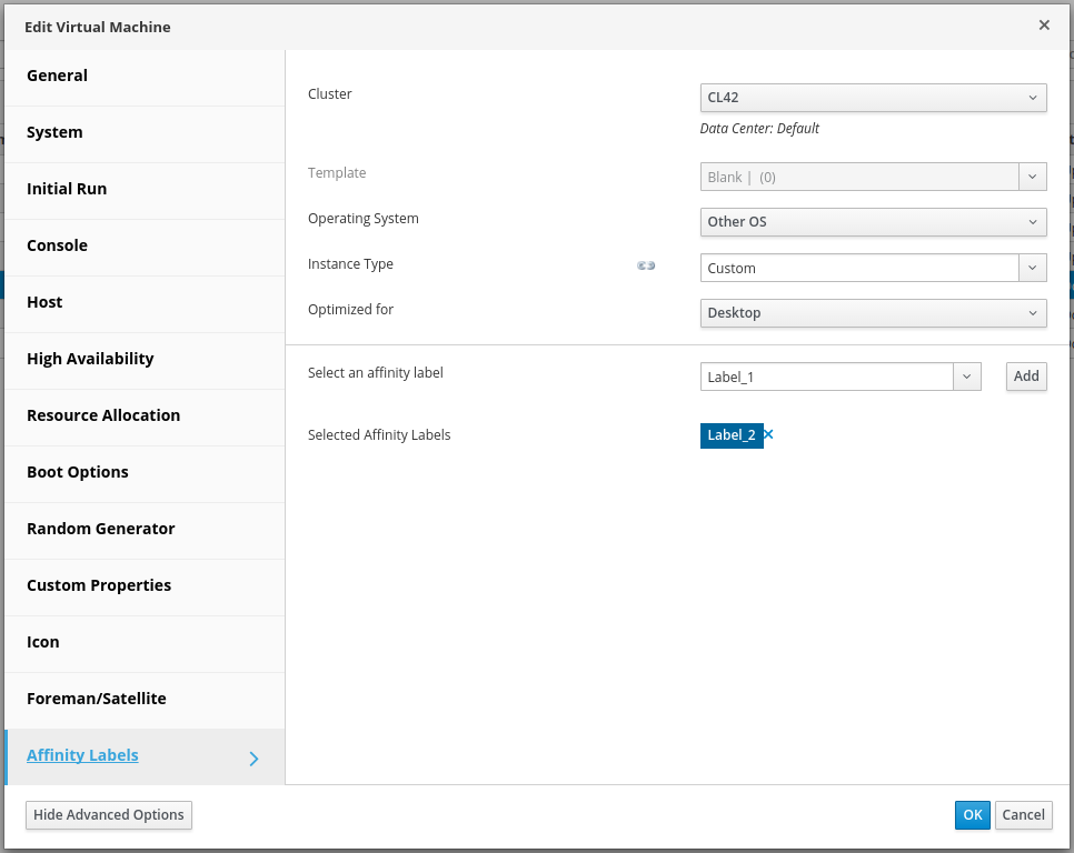Existing affinity labels can be added to VMs and hosts from the “Affinity Labels” side tab of their respective new/edit popup dialogs.