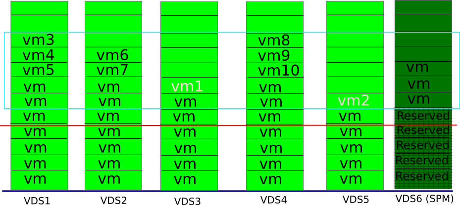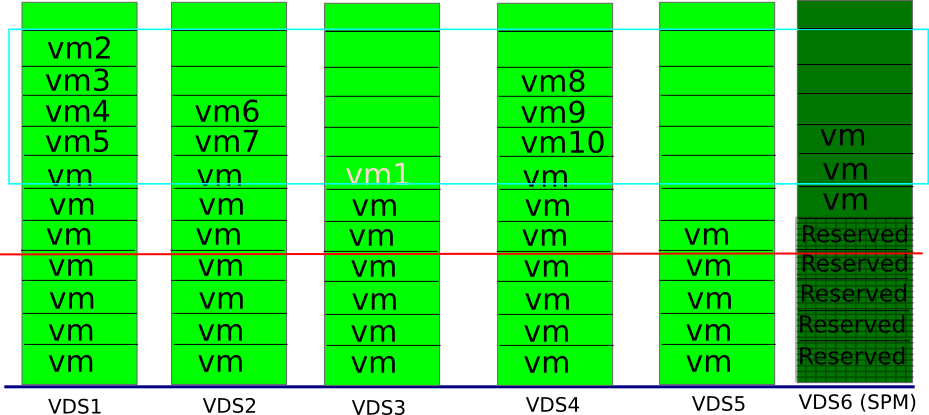 - VM1 moved from VDS1 to VDS3 (to make the example simple, there is no special logic involved in selecting the VDS, so even though VDS5 is also a good target we simply take whatever comes first, but the target VDS should and will be selected by the scoring mechanism based on the count of running VMs on the VDS)
