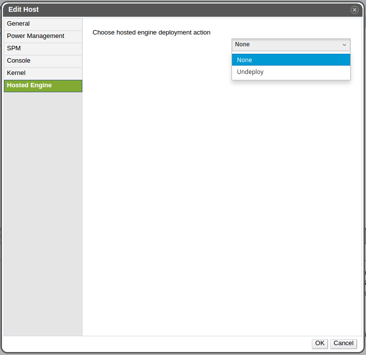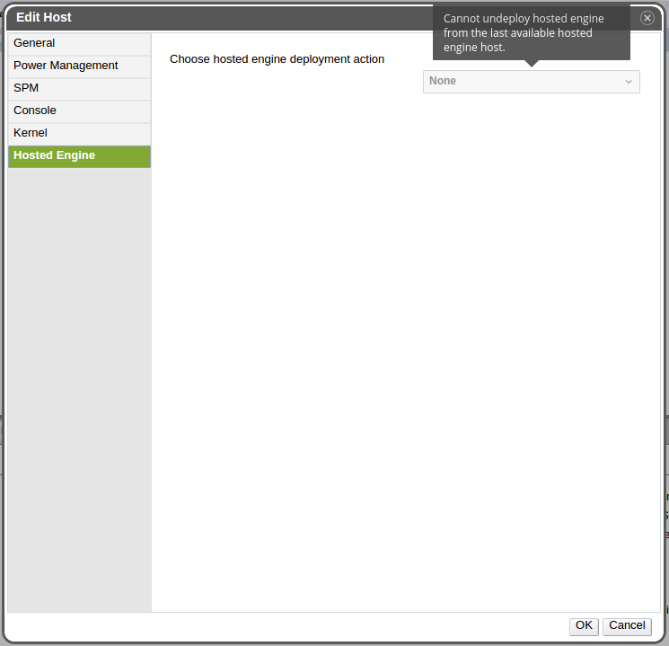 Remove all but one of the hosted engine nodes from the system, then check the side tab in the ‘Edit Host’ popup and ensure that the drop-down box can no longer be selected. Hover over the drop-down box and ensure that a tooltip is displayed explaining that the last hosted engine node in the system can’t be undeployed.