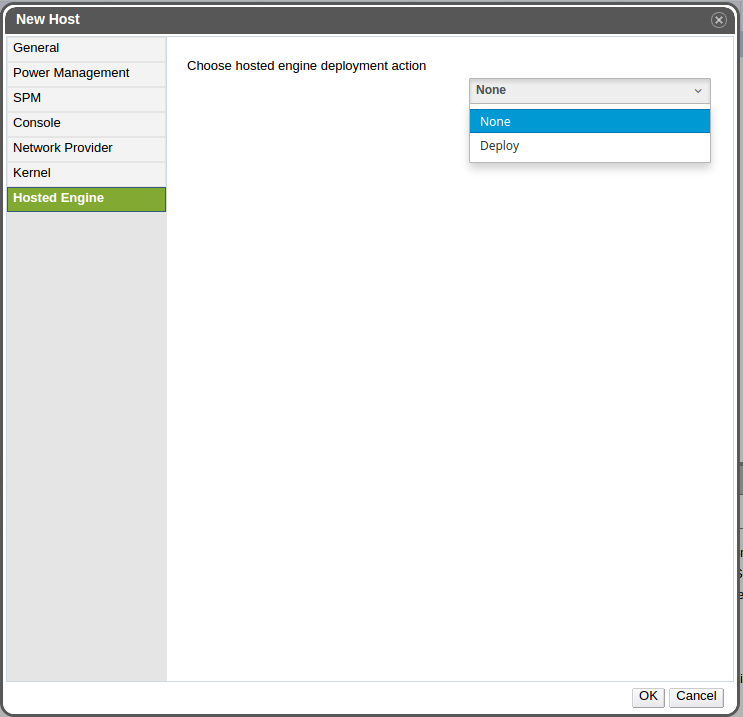Check the side tab in the ‘Edit Host’ popup for the non-hosted engine node and ensure that the only options displayed are ‘NONE’ and ‘DEPLOY’.