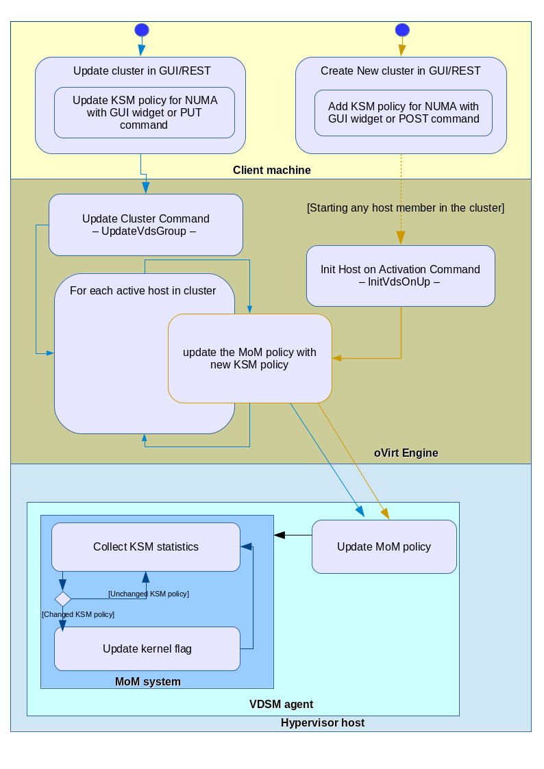 - Refactor engine class UpdateVdsGroupCommand. At execution: concurrently distributed the NUMA aware KSM policy values to each active host (calling VDSM command SetMOMPolicyParameters as in section A above).