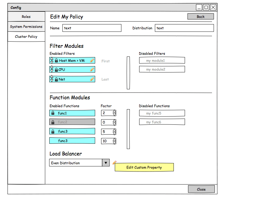 - Load balancing policies related to filters and cost functions. Balancing logic allows auto selection of a VM for migration (from over utilized host to non-over utilized hosts). Existing load balancing policies will be translated to the new format.