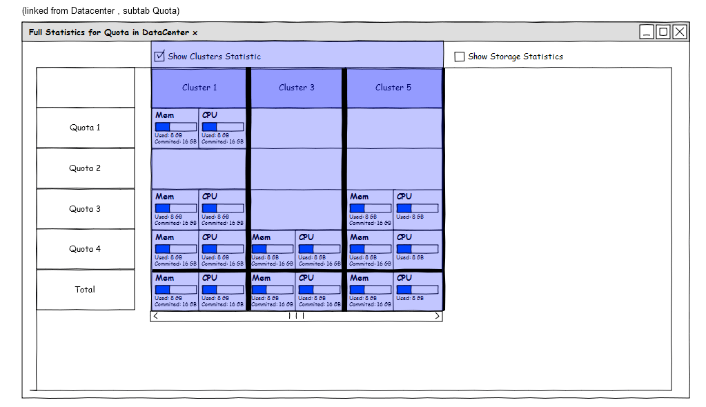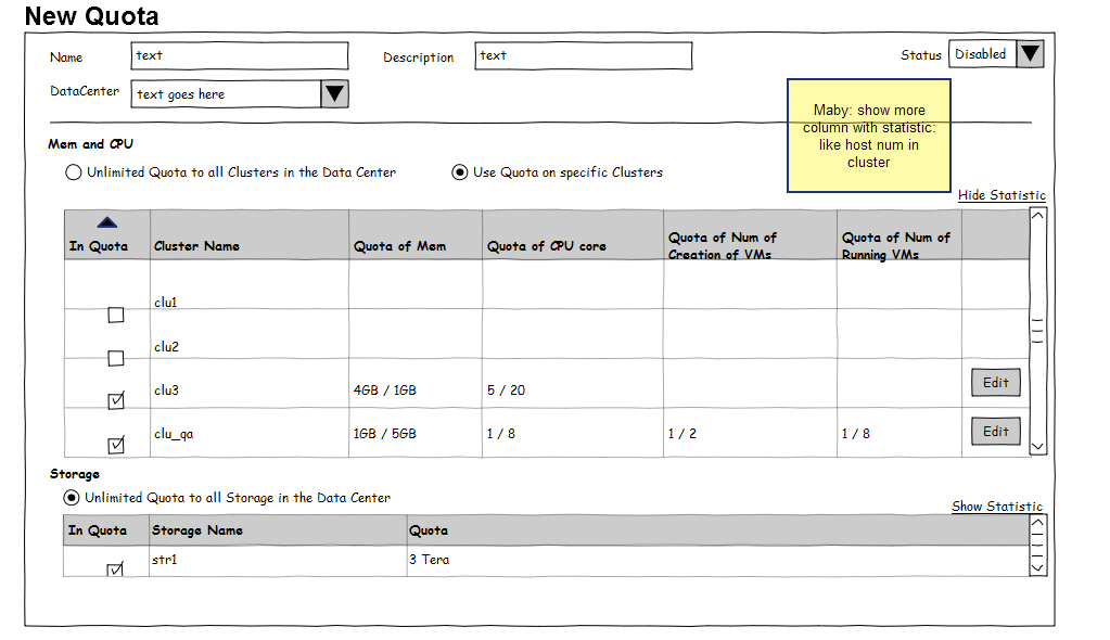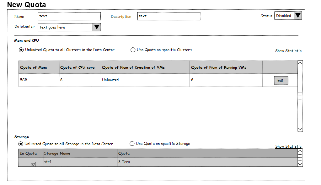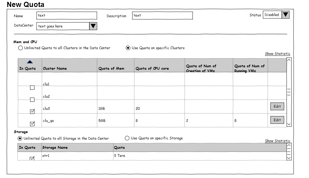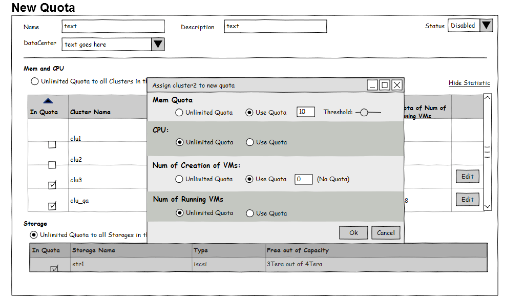 - The Administrator will be able to create/edit a Quota using a wizard. The wizard should allow administrators to configure Cluster Quota parameters, storage Quota parameters, and assign users which will be able to consume the Quota resources.