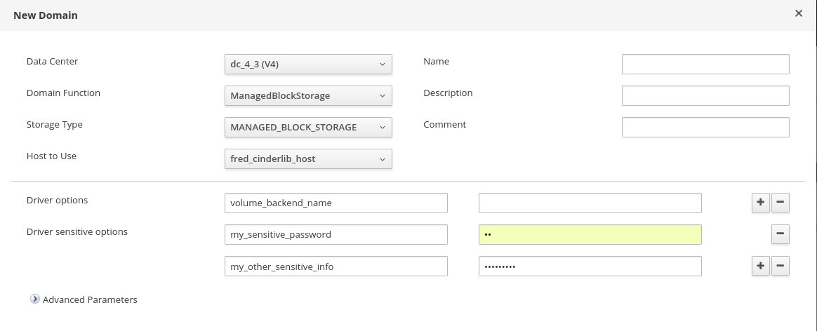 - The user is able to configure a Storage Domain with the name of the Cinder driver and a set of parameters needed by the driver implementation.