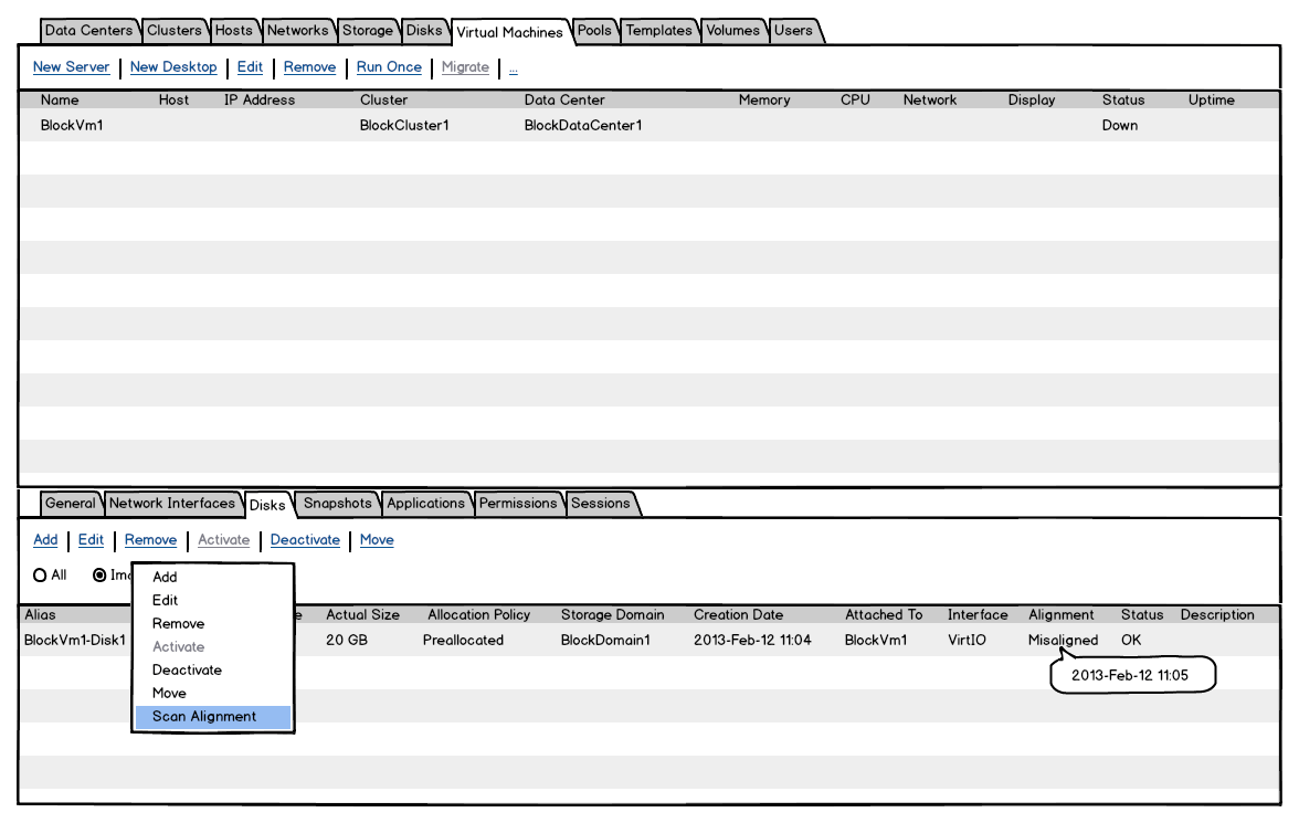This page describes the Disk Block Alignment feature. The main scope of this feature is to provide a way in oVirt to find the virtual disks with misaligned partitions. For more information on this matter please refer to the virt-alignment-scan tool.
