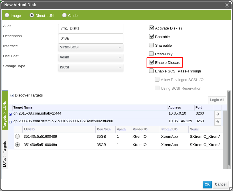 It is possible to enable Pass Discard for two disk storage types: Images and Direct LUNs.