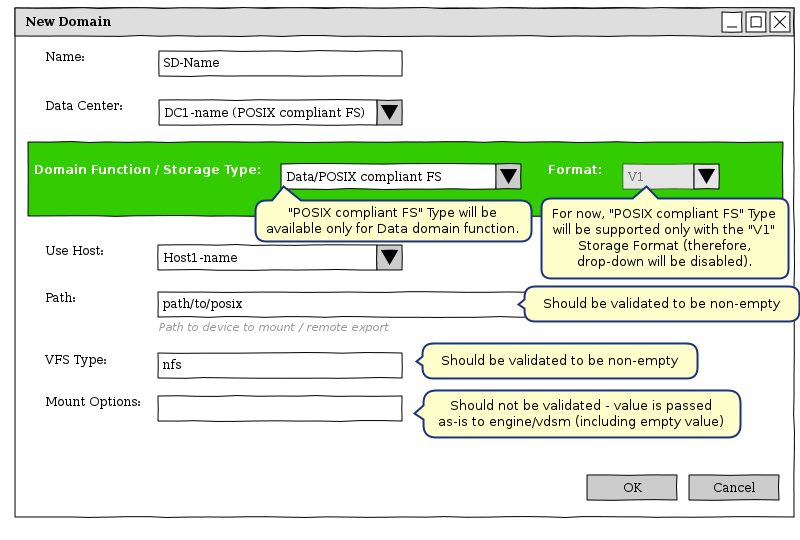 This feature will allow to define a DC of a customizable type. The storage domains in this DC will be mounted with custom properties and will support file system based storage domains which do not necessarily rely on NFS.