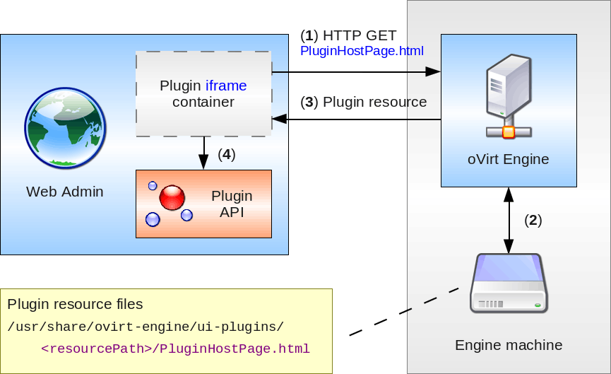 For each plugin, WebAdmin creates hidden HTML iframe element used to load plugin host page (1). Plugin host page is the entry point to bootstrap process, used to evaluate plugin code (JavaScript) within the context of the corresponding iframe element. UI plugin infrastructure supports serving plugin resource files, such as host page, from local file system (2). Host page gets loaded into iframe element and plugin code is evaluated (3). From this point forward, plugin communicates with WebAdmin via plugin API (4). Since the purpose of host page is to bootstrap plugin code, any UI extensions should be done via plugin API rather than direct HTML DOM manipulation.
