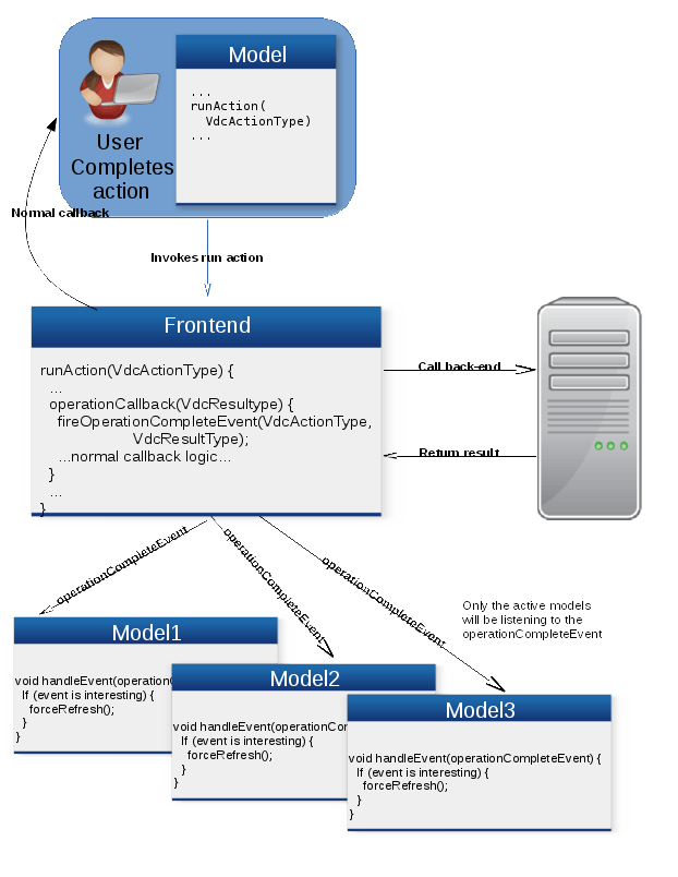 The problem is the fact that an action changes the state of a particular model or sets of models on the back-end and the front-end doesn’t know about those changes immediately. However the front-end does know about the fact that a particular action has completed (namely in the form of a callback from the GWT-RPC code). In a perfect world the action would know which models would potentially be affected and would notify them to refresh their state. However this would create tightly coupled actions and model which is something we want to avoid. As well as it becoming a maintenance nightmare to keep track of which models are associated with which actions.