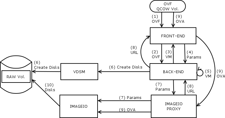 - vdsm runs the ova-ovirt tool that reads the disks from the OVA and according to the import parameters streams the data into the corresponding target disks.