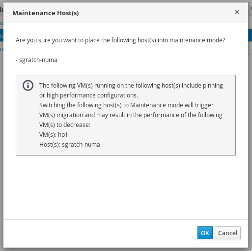 A notification message was added to the “Maintenance host(s)” dialog for informing the user on HP/Pinned VMs that are going to be migrated as a result of switching selected host(s) status to “Maintenance”.