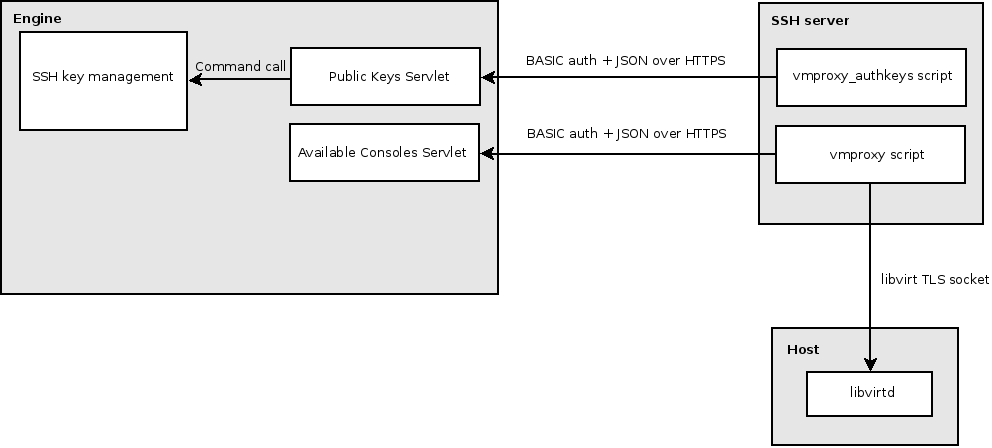User—->[ssh pk(user)]—->SSH Proxy (manager side) —>[TLS socket]—> libvirtd (host side) | V Engine