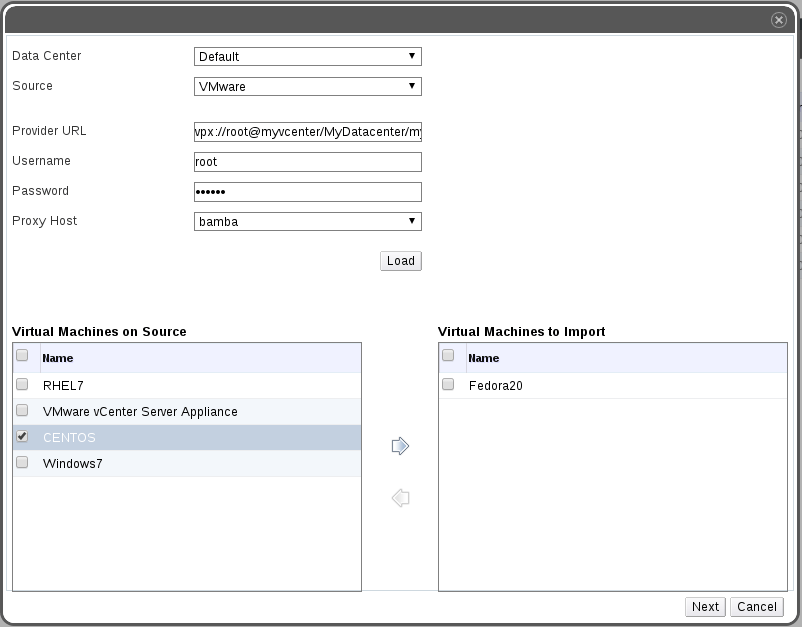 Click the Load button to add the rhel virtual machine to the Virtual Machines on Source box.